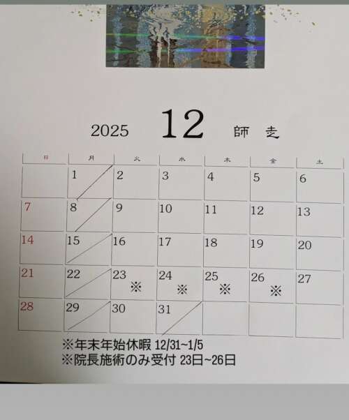 ※23日~26日は院長施術のみ受付いたします (リラックス施術はお休みになります) ※31日~1月5日年末年始休業になります