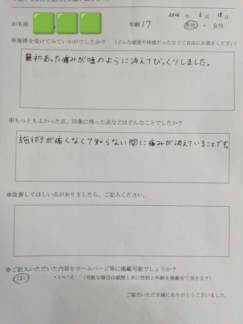 最初あった痛みが嘘のように消えてびっくりしました。